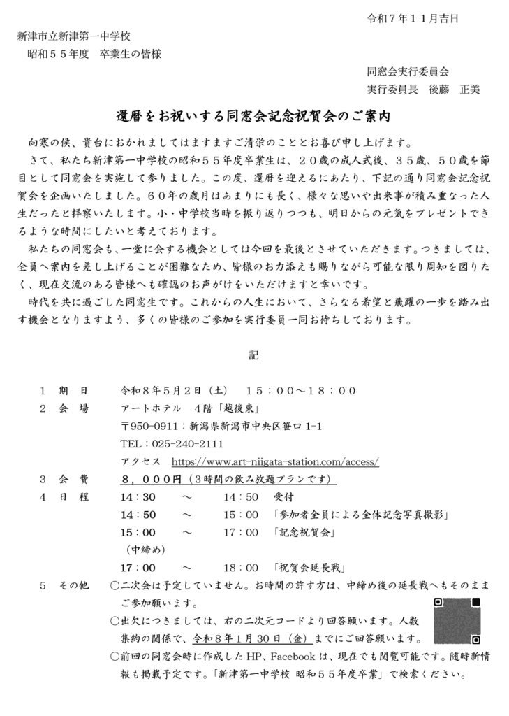 本日「還暦をお祝いする同窓会 記念祝賀会」案内状を発送しました。